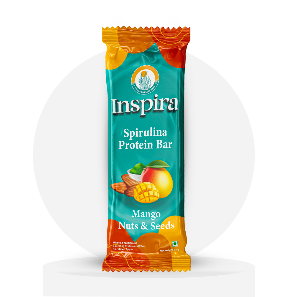 Can’t pick just one? With the Inspira Assorted Spirulina Protein Bar Pack, you get a delicious variety of our best-selling flavors — Creamy Chocolate, Chocolate Coffee, Almond Blueberry, Mango Nuts & Seeds, and Chocolate Orange — all infused with Spirulina, millets, and natural multigrains.